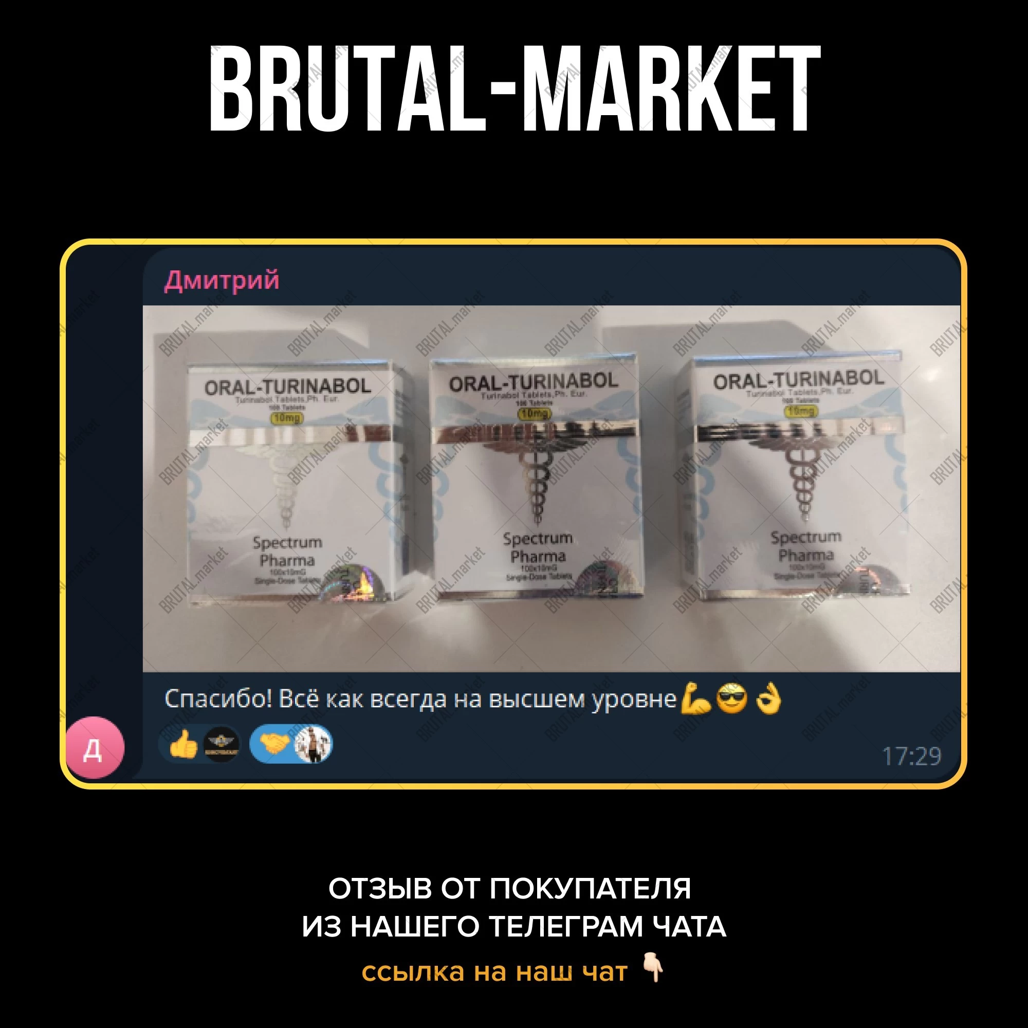 Ярко выраженный рост сухой массы, без задержки жидкости, с минимальным феноменом отката - купите на официальном интернет-магазине Brutal Market. Подробности по поводу доставки и оплаты товара в Москве, по РФ и Миру уточняйте в соответствующих разделах или в телеграмме Админа - @brutalmarket.